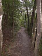 大崙頭山往五指山的前段,有多條往白石湖山的叉路。循稜山徑雖然還是稍有坡度,但多在樹林之間,走起來簡單輕鬆。山徑途中還有幾個秘密基地,頗出乎意料。