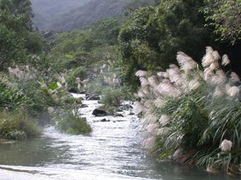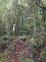 這條古道入口處依舊荒涼,芒草有一人高,必須走四、五分鐘才會穿出芒草叢,如果沒有抱定決心通過,大概會在此就打退堂鼓。穿過芒草叢之後,沿著溪走,都在溪邊林中。這山徑如果不能算古道,至少是條接引溪上游取水的路線。