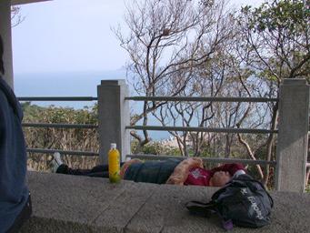 下午兩點左右,我們打算真正要逛獅頭山公園了。這回我們把車直接停在上方的公園入口,省去了那一段上山的階梯。這時我安排的重點是:那個可以面對野柳岬,展望極佳的涼亭。吃飽了,當然要找個地方睡午覺。這個涼亭就是我認為最好睡午覺的地方;因為它跟公園步道有一段距離,少了一些人來打擾。涼亭中的石椅又長;聽著海濤聲悠閒入眠,還有什麼比這個更舒服的事?