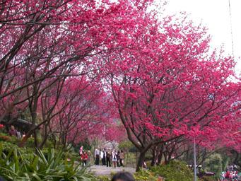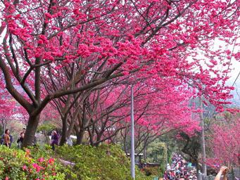 過了花鐘,在湖山路櫻花林所以為背景的的山,應該是大屯山吧。這裡的櫻花開得如此整齊,以致於賞櫻人潮匯聚的如此多,都不是行前所預料的。陽明公園,此番過而不入,不過我想大概開花的盛況也會被湖山路櫻花林給比下去吧。