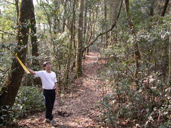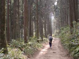 從叉路口往左(右側應該是從第一登山口的路來會),杉林結束,取而代之的是原始林;偶有大型的檜木出現。山徑還是十分清楚,整理的不錯;顯見此路線之熱門。有時路在兩樹之間,猶如天然的閘門;有時山徑在稜線之上,左方可望盡峰峰相連之天際,而林間的鳥兒愉悅鳴唱。雖然是五十分鐘的山路,不過沿途的景色變換要比前五十分鐘的柳杉林來的精采的多。