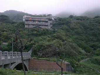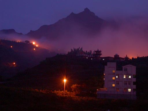 傍晚來到瑞芳。九份擁擠,轉到金瓜石。民宿與雲山水。從雲山水看茶壺山,暮色中,雲氣瀰漫,路燈朦朧, 當地人說茶壺山的山形像獅子頭與獅子尾。小山上的勸濟堂,縹緲峰與靈鷲宮。(2004.4.15)