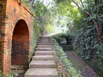 於是我把心思換成尋找三十一番以前。於是我順著長命寺前的石階,一路走下到東明瑤池宮;本來感覺還有些樣子似的。但是後來接回到往東明路方向,我覺得這個方向應該不太可能了。我又爬回到長命寺,退回到月眉路路口,這裡竟然還有石階。於是我又順著石階往下,本來期望會接回月眉路,但事實上會一直往下到山腳下的禮儀社區,詳細的地址是東明路七十七巷75號附近。沿途可以看到水圳,以及紅磚堆砌而成的拱門(? )等,看來似乎有些年代,卻不知當初為何用?