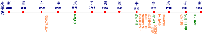 於是當干支、西元、日本紀年都安上去之後,如果以西元做正規化(normalize),這圖表似乎可以解釋禮佛道的年代。那就是若是以廟前石燈的年代庚申為參考點,這也是開山堂建立的年代。在庚申前五、六年,靈泉寺初具規模。在庚申之後,日本人開始在月眉路上施行三十三所觀音靈場的參拜方式。而這都集中在日本大正到昭和初年的二十年間。我想我該去看看五股觀音山的諸石觀音年代為何?