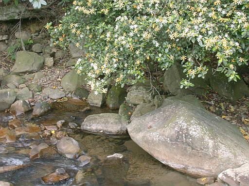 一、草嶺古道北口,新建野薑花田。但前頭的溪畔旁不知名的樹盛開的黃白花,更有意境。