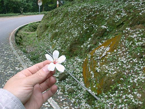 首先因為是從水源路上來再切回汐碇路,所以我腦中的定位儀已經混亂了,一時無法跟小周地圖對應起來。接下來是經過文山茶莊這個地標(約在上圖碇字之下),因為方位混淆的關係,就認為下切白匏湖之巷口應該在文山茶莊與來時的汐碇路口光明寺之間。但是這個路段只有436 巷,與我注意到地圖上的370 巷有明顯差距,而且汐碇路越往光明寺的方向,門牌號數是遞增的。但是此時我仍執迷不悟(或是無心戀戰?)不過436 巷與汐碇路叉路口附近桐花落的美麗倒是頗值得駐足觀賞。