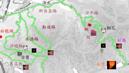 本來想偷懶;過了一兩天,想想還是把圖補一補好了。這張圖有幾個觀點。汐止南方山區山路,大都被規劃成沿路即可休閒的景觀道路,也就是有石桌椅,或有涼亭,可展望綠山林,尤其以汐平路,勤進路為最。汐平路風景最多樣,桐花也最多。水源路太過狹小。汐碇路相對汐平路比較少人,不過車流也少,適合漫步。水源路接到勤進路之後,來到高點,展望也佳,有等同內湖五指山的感覺。