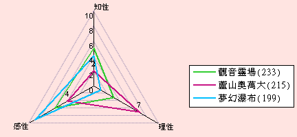是知性的敘述景點特色;還是理性的考證所見所聞;抑或是跟旅行主題無關的藉景抒情?為此我做了一章雷達圖。並找出三篇訴求各自不同的遊記來做分析。而其實我真正想解的問題是,易被外界瑣事觸發情緒波動的緣由。其實不用多做分析也可知,我不喜歡寫「一時」沒有感覺的文章。當發覺接連不斷的瑣事磨掉了創作的靈感時,也會焦躁不安。就有如外表的痛是在警告身體已受到傷害。