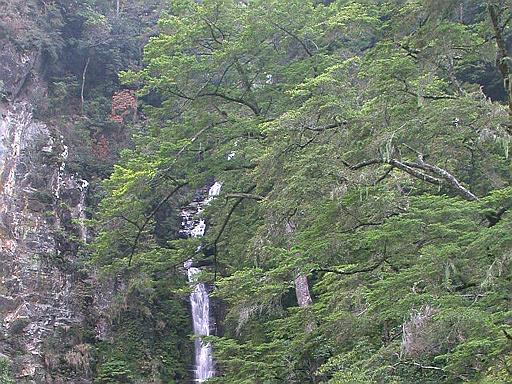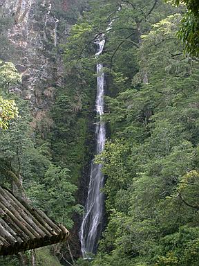 數個提議被退,有點意興闌珊。科伯,做為冬烘先生的大學暨研究所同窗兼社團夥伴,像是看得出我已經懶懶的,就說,不然去走觀霧瀑布好了,觀霧瀑布你不是還沒去過?其實我心裡面寧願去看東線瀑布,因為大老遠一趟跑來這裡。另外一個我對觀霧瀑布沒有太大興趣的原因是冬烘先生的傲慢與偏見,可稱之為「森林遊樂區必有瀑布」理論。這個理論的基本訴求是,對於位在森林遊樂區的瀑布,會有「應該不過爾爾吧」這種先入為主的成見。但我會這樣寫,那就表示我錯了。此時位於海拔兩千公尺左右的觀霧瀑布水量甚豐、落差甚大,由遠處觀之,猶如迴旋糾纏在一起的雙龍。