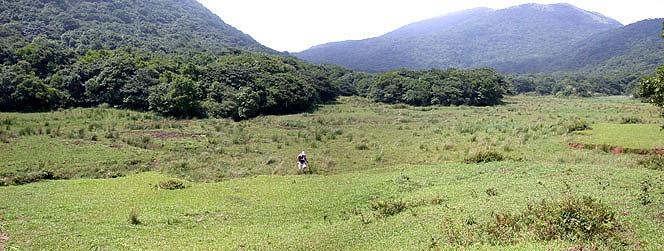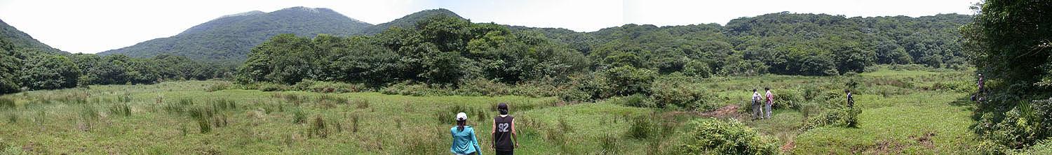 至於今天我的取景著重在看磺嘴山與看翠翠谷。看磺嘴山巔遙想山頂火山口的大草原。也看翠翠谷,但這必須是從稍高處觀之才能把山、把沼澤,把這狹長型翠翠谷的整體感覺營造出來。從稍高處的小丘才能看出沼澤的形狀,也才能明瞭怕腳濕的蕭郎為什麼一開始猶豫不前。在磺嘴山腳下的這一片少人到訪的谷地,熱衷尋幽探險的人們,施展沼澤草上飛的輕功,在大太陽下所有的舉動,顯得超乎尋常的真實。