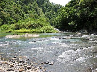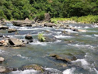 一邊撤退,一邊仍不放棄的注視著溪。後來還是給我看到一個點。對岸似乎有明顯上岸之處。而溪流之中有一塊石頭。從這一岸到那石頭,從那石頭到對岸,溪水深度只及大腿。今天過溪不用擔心水太深、太急,甚至也不會太滑。姑婆寮溪就是一條這麼容易親近的溪。只是那時候我還不知道原來我所溯的,其實還是屬於「魚逮」魚坑溪的一段(8/17)