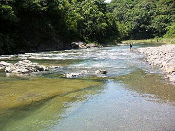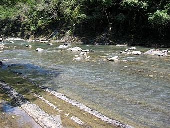 今天雖然沒穿溯溪鞋,但還知道要穿短褲,並帶了涼鞋。所以並沒有如一開始的歌所唱的,把衣服褲子通通脫掉。溪畔有人在樹蔭下煮食與休憩。小朋友們多在此處浮潛游泳,因為此處溪水淺而水流平緩。我初時沿著我右手邊的溪岸,大多時候踏水而行,有時也又會回到岸邊。其實我想的都是在取景:溪水的綠、溪流的和緩易親近、溪流中的狗齒岩塊、自然形成的碧潭等。
