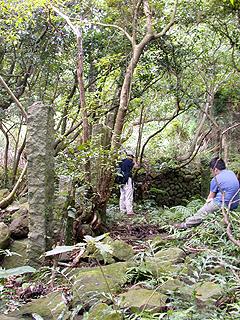 走出松林棧道與車道會合相接,續往前行,經過松鼠很多的地方後,二號屋遺址就在路左邊的箭竹叢後面。開路先鋒雨傘大俠與楊大哥手持屠龍刀一路砍劈進去;隨後小刀會在後頭就只能揮揮鐮刀意思意思。你說我在幹嘛啊?百無一用是書生;我這個手無縛雞之力的文弱書生,當然連揮揮小刀都不必了。等大家殺進去之後,我再慢慢踱進去巡視戰場即可。不過這剛清理出來的小徑可是陷阱處處。被竹子絆倒還算事小,被尖尖的刺到要害那可就不得了。至於為什麼前面的先鋒清理過後,路徑上還會留有陷阱?這..且略過不表。