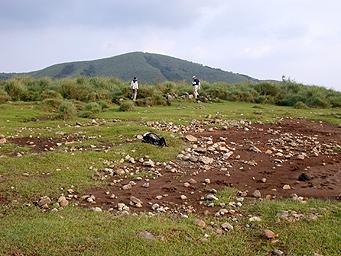 不過山丘之上倒無芒草漫生,只有短短的草皮,與小小的亂石堆散佈。但沒有短牆,也看不出營盤址模樣。我在想山丘上芒草不多,是否跟營盤址地基有關?另外靠近南方地面有碎石約略成列,這大概是最像營盤舊址的地方了。後來我們又摸索往不遠處的碉堡,但也一無所獲。