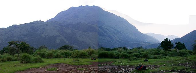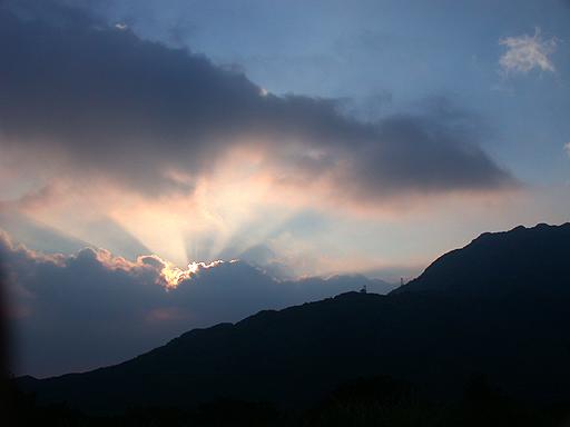 本來還商量說要不要摸黑去魚路古道上尋守磺營,後來還是算了。因為此時的夕陽落在雲堆中,射出幾道燦爛光芒,把眾人深深吸引住。一屁股坐在地上,就不太想動了。字戀姐跟我說,可以看到五分山呢。我認為怎麼可能..。字戀姐把手往七星山與七股山之間一指說,哪,那山頂上有圓球的不就是五分山?