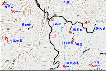 下午續往擎天崗附近尋河南勇營遺址。其實它的位址只要看地圖等高線就已經呼之欲出。我們從冷擎步道瞭望台看見不遠處山丘上的碉堡。但是我們卻不是直接沿著一排松樹上山丘,而是先往下走到墳墓區,穿過樹林後,在一片芒草叢中撥亂反正,看似無路似有路,最後終於上到山丘上的平台。