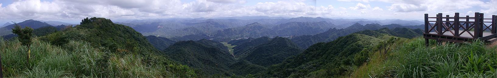 (姜子寮山頂展望,從東北東方之五分山至西南方之平溪薯榔尖。你可認出的山有幾座?)