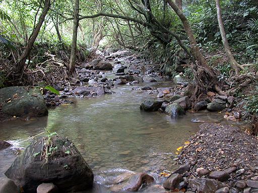 從聚落下來穿過竹林,約十多分鐘,下到溪畔。帶頭的我(何時又變成我帶頭了?)一直試圖藉由沿途景物在回復印象。我記得上回(行腳241 )走石梯坑古道就是過了溪又上了坡不久即折返。雖然現在的溪畔看起來很像當時走過的..,不過我的疑問卻在於沒看到往草山戰備道的指標。如果沒看到指標那就只能表示此處非上回之過溪處。