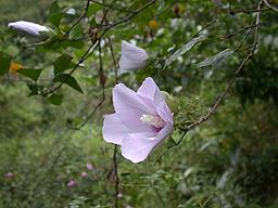 從入口開始,一直到離開龍洞坑溪上山為止。我們大致沿著龍洞溪畔而行,並來回過溪數次。每次過溪,我總是被林中的清淺小溪所吸引。這條溪的沿途還有幾處田的痕跡,因為有駁坎。略有幾分鹿堀坪古道的感覺。如今這些田早已長滿蔓草。但大小木槿開的甚是鮮豔,可謂花團錦簇。