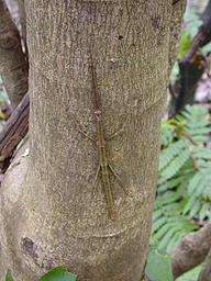 過溪處休息一會,我們續行,上坡又行,從樹林走出,可展望仁愛橋方向山谷出口的海。這裡左後方有叉路在上,莫非這一條才是石梯坑古道的正路?我上回的印象已有點模糊,不記得曾經看過有這裡這個叉路口。不過我知道可以看得到海的展望,往前走不久就是左邊往基石的坡徑,而直行無路,唯有右方陡下直接到溪底才是正路。
