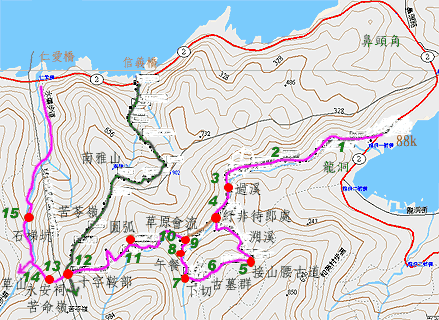 蕭郎他們三個也料想我們必定吃完中餐就會順著溪下來,所以就等在這個路口(9),也把中餐順便解決了。所以本團真是素質很高又頗具默契的..。