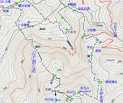 雖然身體微恙,中耳發炎,耳朵隆隆地響,不過還是跟上這次大夥的行程。我必須說我就是上一篇遊記中所說的沒有做功課就來爬山的人,我是自己在數落自己。所以說今天這樣的行程長度如何,其實我沒什麼概念。不過要從一0一公路上到八、九百公尺面天山,相信這聽起來就不件輕鬆的事情。不過我今天六、七個小時走起來感覺還好,無所謂累不累,左右舊腳傷似乎也都無大礙,這應該是值得慶幸的事情。