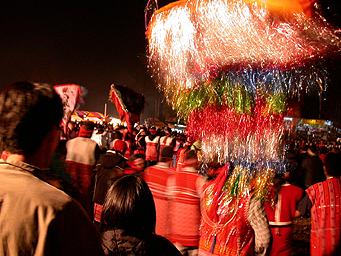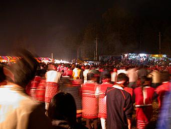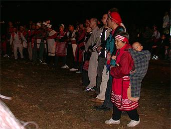 傳說中必須要在身上結芒草以避邪,不過現場人群的舞動並沒有給人太多的神秘感。加上有幾圈是屬於觀光客的參與,看起來還是像豐年祭。今天來尋找賽夏族神秘之處的人可要失望了。隨興的觀光客或有把圈子轉動的比較奇怪時,就會有工作人員出來帶引維護整個歌舞的格局。這是娛靈嗎?還是在娛人?就好像超度,是在超度死去的人,還是仍活在世上的人?