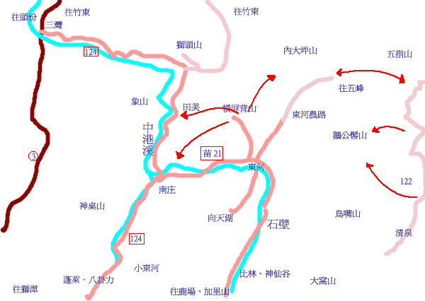 就算鹿場的風光在怎麼漂亮,同行膽小的人說什麼也不肯讓車子往前開在這種殘破的山路了。我們把車調回頭往東河方向走,準備找另一個投宿的地方。本來依我的意見是可往蓬萊方面 。不過我們剛剛經過往鵝公髻山的東河農路附近,就有人被也是在網路上傳的很熱的休閒庭園咖啡之類的「山形玫瑰」招牌給吸引了,於是一個右轉上山,想不到因這麼一轉,我們隔天還多了一座山可以爬。