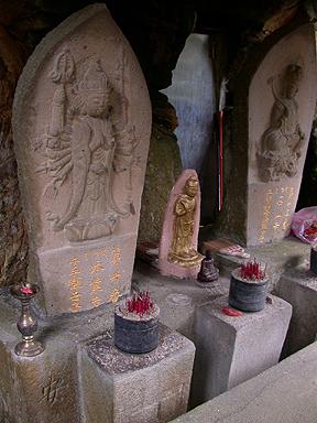 或問曰,那圓柱與那刻有卍字的石塊又是作何用途?從以下的圖像中(特別是愚園中觀音亭給我的靈感)可以歸納出幾種可能,雖然其實也是穿鑿附會居多。兩旁的圓柱之頂上都有圓盤型的凹陷,會不會擺圓底座的瓶子或是燭臺?至於基座前方的石塊或石臼是不是如下圖是用來擺設香爐的?或者本身就是香爐?還是根本徹底跟香爐無關?日本人進寺廟有拿香的習慣嗎?我印象中好像沒有。真正的佛教好像也不需要香火朝拜的。所以這個算不算融入台灣文化?見聞淺 薄的我只能說我不知道。