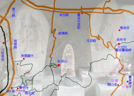 下雨天的下午,打算利用三個小時不到的時間到寶明寺尋找赤腳大仙所提到的兩尊石觀音。因為地緣的關係,很自然的會認為這兩尊觀音應該跟月眉路上的觀音靈場有關係,雖然這兩地之間隔了座紅淡山。所以此次除了要驗證這兩處的觀音石像是否真的有關係之外;還要綜整觀音山的觀音石像與基隆的觀音石像之間的差異性為何?(註1)