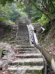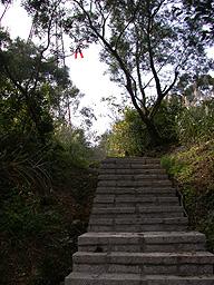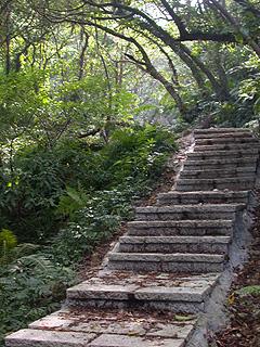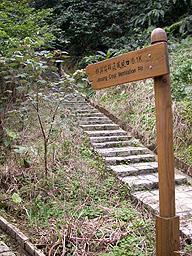 離開山頂後,我很想要找到三年前上來的路。在山頂上的路,如果是枕木,據說就是往風格山莊的,也就是我三年前下山走錯路,誤闖山區最後出來的地方。至於新舖的石子路,則很像是我三年前從九重宮旁上來的路。只是當初山頂遍生的草蕨早就為建新路而被剷平。我來到山豬窟尖山之前,看到一條花崗岩步道直接陡降下山(到市民農園),應該可以確認,我三年前來時根本沒有看過這一條新路。