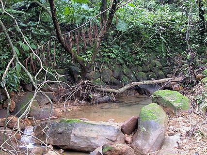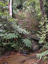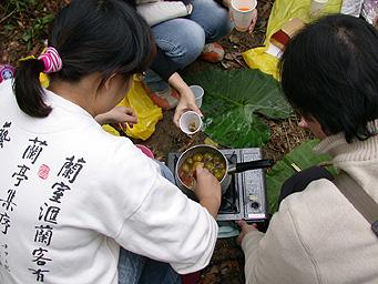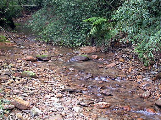 我們路過了粗坑2號附近,不明顯右邊往下叉路,果然還是讓先頭的人走叉。我將他們喚了回來。繼續往下走,來到一條小支流,附近有一座小橋,這就是我預定的午餐地點。我覺得平常這些人難得在山中午餐,因此一旦有鍋爐等,就開始想一些吃的花樣,尤其是當很多女人聚在一起。當然君子雖然負責背鍋爐,但是還是遠庖廚,我只要負責吃與讚美就行了。