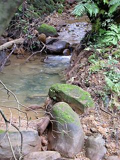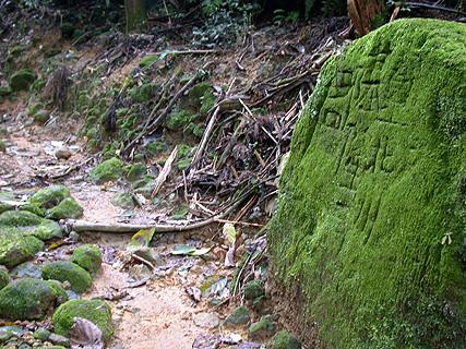 我去年來時就覺得沿途果然清幽;不過由於昨晚台北下雨,今日山徑有些濕滑、泥濘。我想大家都在注意腳下步伐,無暇如二次來的我能欣賞古道上風光景緻。譬如古道中途刻著「台北州基隆郡」的餅狀石;透過竹林或是杉林間的古道光影。至於路過的幾條小溪流都是清澈非常,如果在夏天,會更讓人想在此嬉遊留連。過鐵橋,上山坡,前方是日出而息,日落而作的農家。我把法賓兄所說的軼事講給大家聽,大家都是莞爾一笑。接下來我選擇往右邊走了,如此可直接從幼坑瀑布上源的小支流來到平溪線的鐵道。