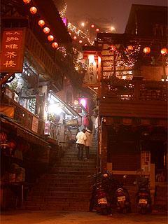 過年前的最後一個週末來到九份,黑漆的102 公路上沒有多少車輛 ,還沒到九份前似乎已感到一份寂寥,屬於過年前觀光地點的夜晚本來就有的寂寥。公路上遠遠就能望見山城籠罩在霧中的模樣。 走在山城之中,立在坡徑的茶館迎賓人說,這大概是九份最冷清的一天吧。沿著坡路下來,不知聽到多少沿途茶館歡迎光臨的聲音,回盪在清冷的夜空中,有一種滄桑..。不斷的歡迎聲,竟然反而令我加快我下坡的腳步..。