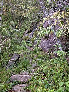 橫龍古道前十分鐘陡上,拜堆砌石塊之賜,相對好走也不會再怕滑倒了。不過石塊堆砌的有些不甚牢靠。上到小小測後站之後,石階結束,古道又恢復樸實模樣。