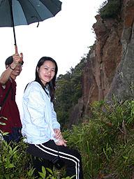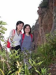 走過岩壁後的左方有一小小的展望台,其實也是斷崖,還可以望見右側陡直略帶赭紅色的山壁。我看了Andy與阿亮兩位的遊記,都有這山壁的相片,難道這山壁是走橫龍古道必定要拍的嗎?如果必定要拍,咱們的開心少女團自然不能錯過。只是拍出來的效果,正如果今天的天氣一樣,有點詭異。而此時天空終於開始下起雨了..。