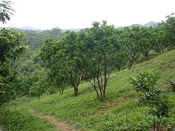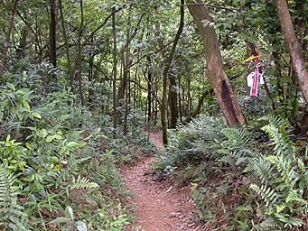 鞍部開闊處有人以橫木供作休憩之處。至於往康樂街方向有一大片果園,不知是不是百香果?老鷲尖上往五指山方向的展望很不錯,雖然我對山頂上另一條下往八連路的小山徑也很有興趣。