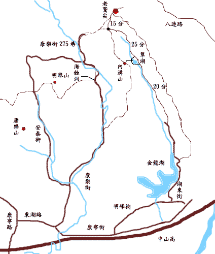 來翠湖,應該還是要從湖畔上內溝山(大尖坪山)。如果沒從山上俯瞰翠湖碧水,等於是白來了。尤其是登山徑的中途有一個開闊的展望平台,於此臨風顧盼自是十分愜意。我猶記得多年前初次來此,曾經見到山水雲所題之「仰看藍天白雲,俯視翠湖碧水」小牌示,不過此番卻已不復再見。或許,五月來此,看到翠湖附近的溪谷與山林如同被白雪覆蓋般,又是另外一番浪漫滋味在心頭吧。