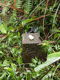 下了茶莊,就近先攻位於中研院附近的茅草埔山北峰,這個山到底從哪裡上去?要走多久?其實也不甚重要。總之從太極宮再往上去來到菜圃之後,山頂已然在望,只是亂草叢生路徑不明。由於人多之故,眾人兵分兩路攻上山去探,至於我等老弱殘兵留在菜圃等待消息。不久,果然傳來已發現基石的好消息。留守眾人一起蜂擁而上,共同見證這蕭郎的999。字戀姐在基石上留下兩顆剛才在路上撿到已經破掉的紅頸斑鳩的蛋殼,預告第一千座的即將來臨。