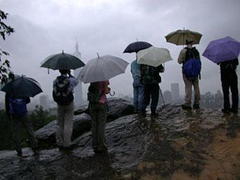 今天是蕭郎要攀登第一千座山的日子,大家都說要幫他慶祝,陪他上千山。因此昨天蕭郎為了趕進度,特地冒雨到礁溪將進度推進到998,不過今天的天候依舊不佳,凌晨還下起傾盆大雨。不過大家興致頗高,連一向不喜歡雨中爬山的蕭郎也沒有表示反對意見,只是將原定在北宜公路上行程轉移到就近的南港與松山進行。只是早上十點多,雨還是下得太大,住在新莊被困住不能出來的紓非還說要來個先下海再爬山的海陸全餐。最後大家決定要先找個地方聚餐然後看天氣再做打算,於是一向負責找吃的我,將一行人帶到南港的茶莊,一邊喝茶聊天,當然也要先祭祭五臟廟,禱告天空不再下雨,並隨時伺機而動。
