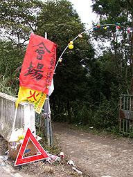 我在步道口跟一個穿著義警的伯伯確認這會場入口就是通往石磐步道後,便想幫伯伯與紅色會場標示拍一張。伯伯說,不要拍他啦,他不夠帥,裡面的風景才漂亮,到裡面拍啦,說著說著就跑掉了,忘記他還要把守門口大關。