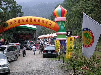 因為在一個很像入口的地方(其實這就是入口)路旁停了許多車,但卻沒有什麼指標,讓我把這個會場入口當作不知在辦什麼活動,而這樣錯過了。其實真的是在辦活動沒錯。今天(5/22)恰好是這條步道的啟用典禮,鄉里的人都自動組成義工與秩序維護隊來幫忙。裡面果然也有一個會場,歌唱的聲音傳遍附近山區,讓我還以為怎麼林美步道周邊也跟人家趕流行,附近這麼快就開起卡拉OK店來了。