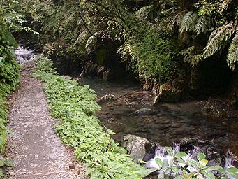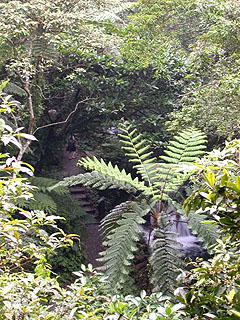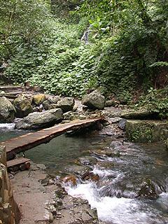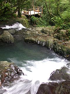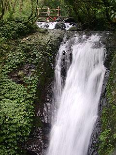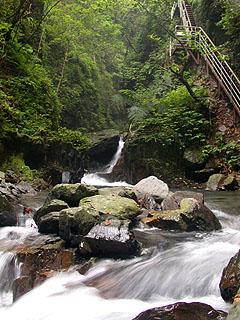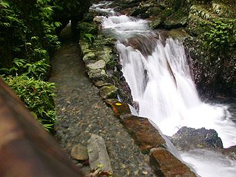 這條步道的特色是它是一個O形路線,以石磐瀑布為一個轉折點。去的時候緣溪上行;回來的時候就是山腰小徑了。 步道中途有一個引水的小小水道,大概是接引上游瀑布的水來著。我認真的在小橋邊、幾段木梯上拍攝水的流動。這樣優美的溪邊步道,處處都是景緻,讓人駐足留連,只為了嚐試從不同角度來看溪水石上流的各種不同面相。