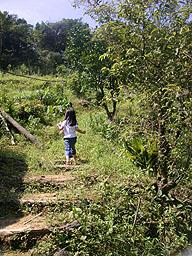 我們在烏山古道入口農家詢問了一下當地人。結果登山口竟然是從阿婆家後院穿過之後,走過田埂小路才會開始進入樹林之間。阿婆說他們以前都是走這條山路從烏山到灣潭,大概要四十分鐘。事後我看了一下我們的時間卻差不多要兩個小時。這阿婆莫非也不是尋常人?就在阿婆幫我們指路時,她的孫子們也嘻嘻鬧鬧地問我們要去哪裡?然後要跟我們一起走。當然最後還是被阿婆給喊回去了。