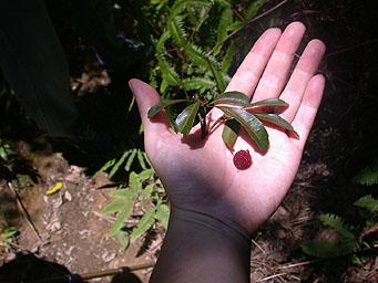 路徑越來越寬敞,我們經過了一處可能用來擋住牛的柵欄,稍後也路過了一土地公廟。走著走著似乎已經快到古道盡頭。字戀姐倒是停留下來開始撿拾掉落的樹梅。並告訴我們林中那一棵樹才是樹梅,準備給我們的水果大餐加料。就在此時,去登網形山回來的蕭郎也追上我們了,哈哈,真是厲害。