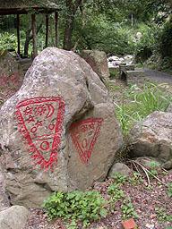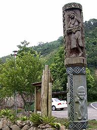 繼續開車往上游的八卦力部落,漫步八卦力吊橋、賽夏族文化廣場。部落裡的石柱、木雕,甚或是路旁的石塊上都刻有賽夏族的圖騰,主要是以百步蛇的圖紋居多。我想起我那隻有著百步蛇圖樣的陶笛..。