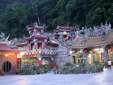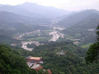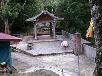 總之去程的十分鐘,由於林中陰暗,心中忐忑,走起來感覺像是半小時。到了三角點所立之處,為獅頭山的一個崖頂,可以展望西方。頂上有一氣象測候站。拍完照後沒有多作停留,旋即下山。下山的十分鐘走起來壓力就沒那麼大,感覺走了五分鐘就又回到望月亭。至於再下到勸化堂、輔天宮就約略七點了。黃昏暮色中,在山腰步道上望這一大群燕尾翹脊的寺廟宮殿,彷彿置身於某處仙山勝境。只有在人潮喧囂都散去之後,才能看得出來是否是耐得住寂寞的真修行。