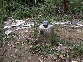 望月亭雖然是獅山古道的最高點,而且是新竹與苗栗的交界,不過從紫陽門走到這裡還只算是走了整條古道的一小部分。此時山上朔風野大,古道無人 頗為冷清。這還不是終點呢,三角點要從左側邊坡上上去,有登山隊牌示說要十分鐘。這十分鐘就是給登山者走的登山徑了。六點多天色昏暗,為了那一顆三等三角點,只好就像飛一樣 地趕起路來。雖然路徑還算清楚,不過沿途有倒樹略有崩落的土石,這條登頂山徑好像也沒有太熱門的樣子。