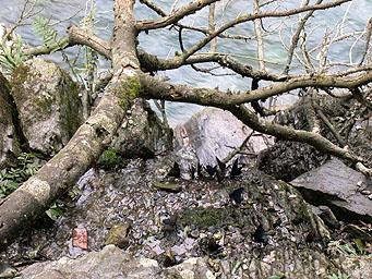 台灣水鴨腳粉紫色的花開滿了沿途步道的山壁上甚是壯觀。我立在步道旁的欄杆不經意往下方河岸望,怎麼會有這麼多蝴蝶聚在一處呢?