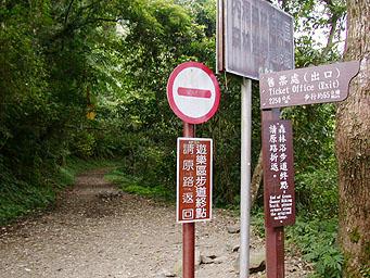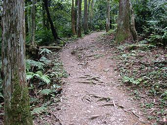 步道的中後段就開始在柳杉林之中了。如果在林中有風的情況下一定很舒服。不過現在的情形是,空氣中有一種凝結很悶的氣氛,大概是準備要下雨了,所以一點風都沒有,雖然也沒有陽光,不過卻是悶的讓人汗流浹背。